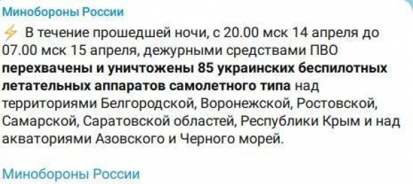 За ночь средства ПВО сбили 85 украинских беспилотников