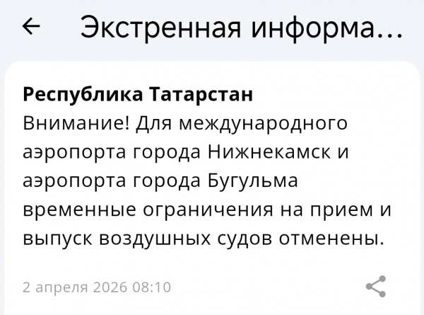 В аэропортах Татарстана сняли ограничение полетов. Оповещение пришло в мобильном приложении МЧС России.