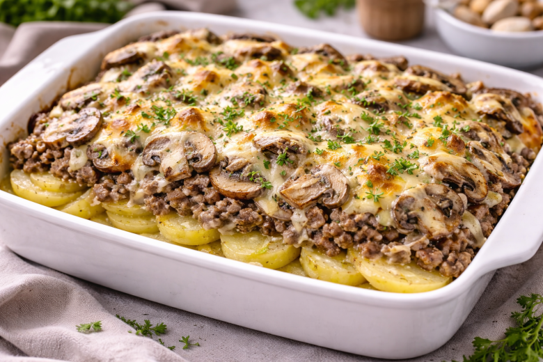 Кладу слоями фарш, картошку и грибы: самая вкусная и простая запеканка, которая легко сойдет за праздничное блюдо