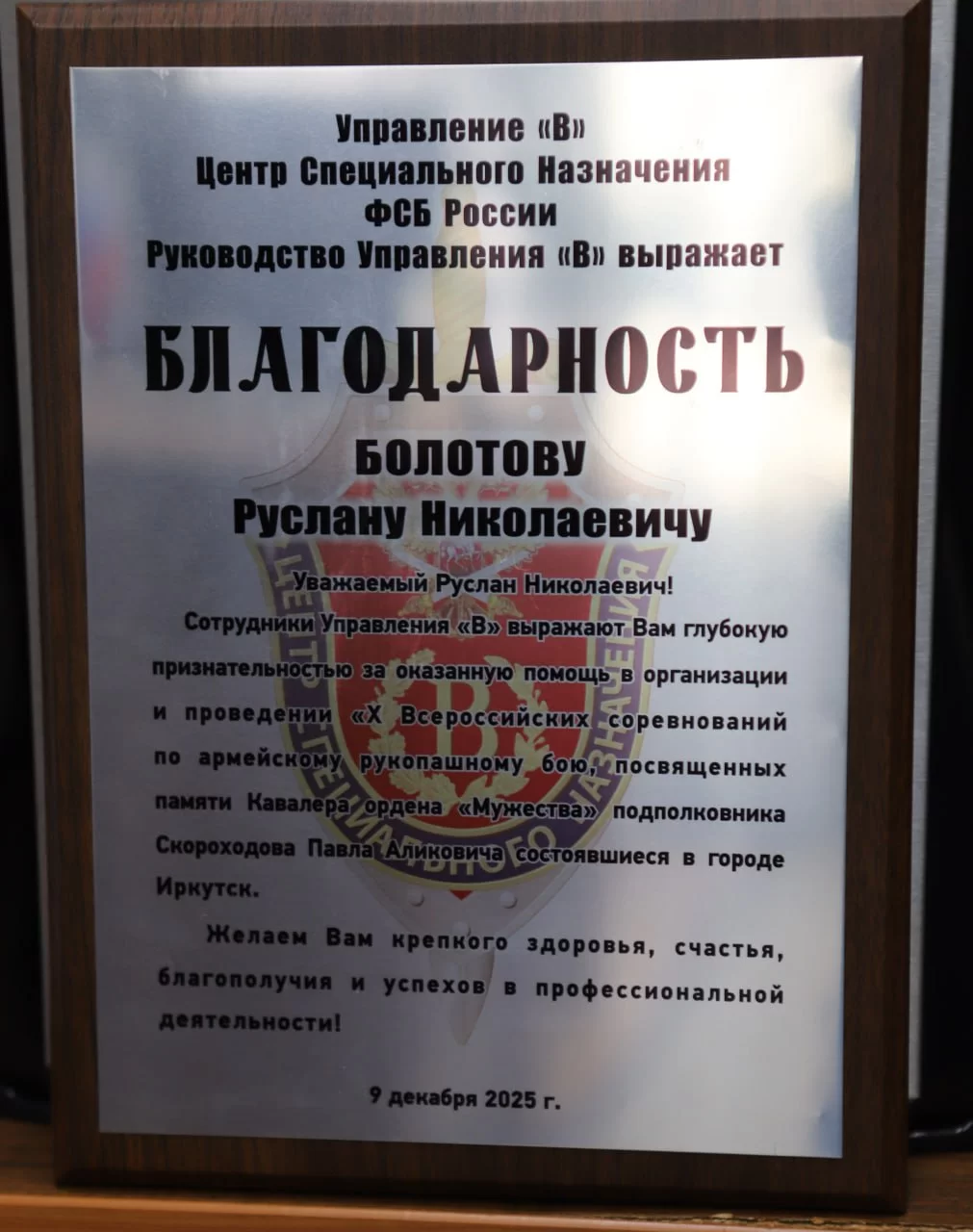 Михаил Мелкоступов передал Руслану Болотову благодарственное письмо от офицеров Центра специального назначения ФСБ России «Вымпел» за содействие в организации и проведении с 2015 года Всероссийского турнира по армейскому рукопашному бою, посвященного памяти кавалера ордена Мужества, сотрудника ЦСН ФСБ России Павла Скороходова.
