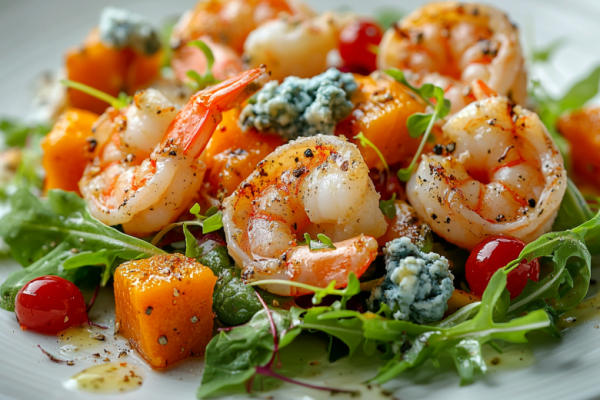 Этот салат — настоящая симфония вкусов! Сладковатая запеченная тыква, нежные креветки, пикантный сыр дорблю и цитрусовый соус создают удивительно гармоничное блюдо.
