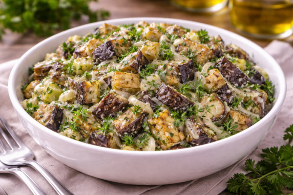 Если хочется чего-то простого, но с насыщенным вкусом, этот салат выручает всегда. Баклажаны после запекания становятся мягкими и ароматными, а в сочетании с луком и заправкой получается та самая вкуснятина, к которой возвращаются снова и снова.