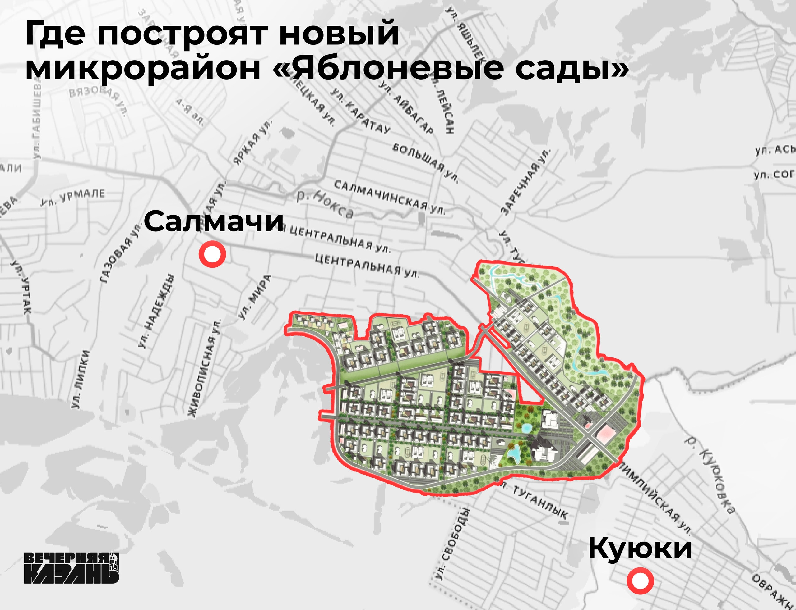 В скором времени поле между Куюками и Салмачами «обрастёт» новостройками микрорайона «Яблоневые сады». Как сообщили в группе компаний ASG, проект планировки был утвержден в 2025 году. Как выяснилось, к нему предъявляются очень жесткие требования из-за проблем прилегающих посёлков. Однако, как сообщают в компании, проект может решить большинство из них.